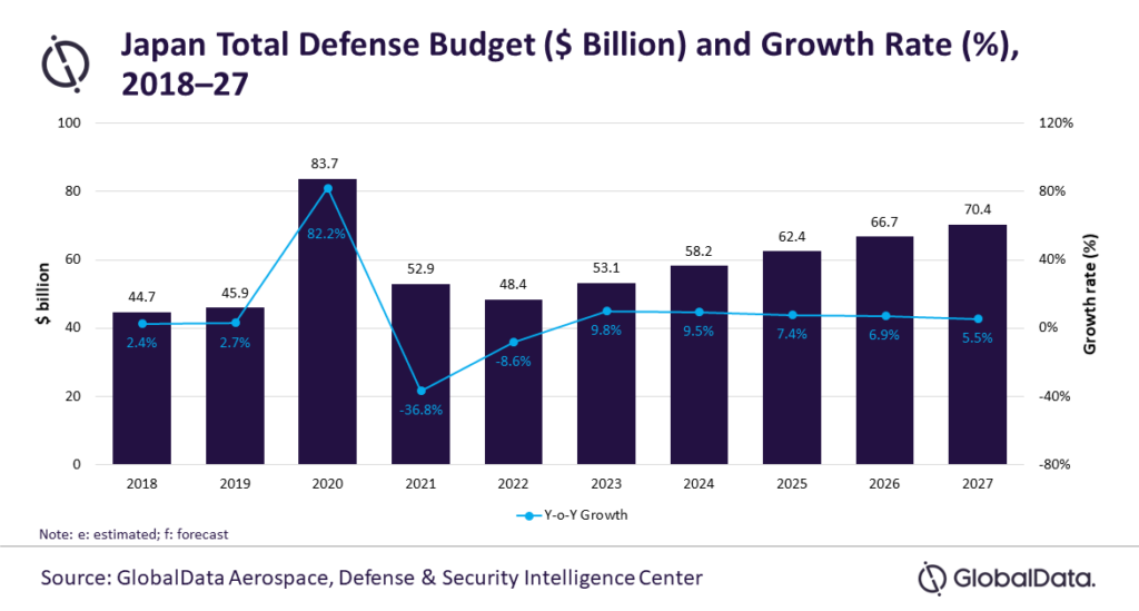 GlobalData’s latest report, “Japan defence Market Size and Trends, Budget Allocation, Regulations, Key Acquisitions, Competitive Landscape and Forecast, 2022-2027,” reveals that Japan’s defence spending is anticipated to grow at a compound annual growth rate of 8.4% during 2022-2027.
