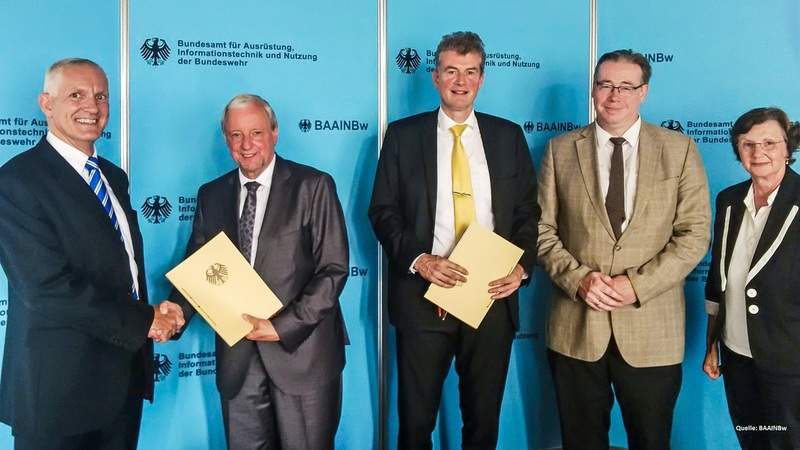 Image: Representatives of BAAINBw and Rohde & Schwarz at the contract signing. Photo: courtesy of Rohde & Schwarz.