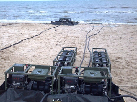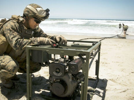 KIN BLUE BEACH, Okinawa, Japan - Marines ran down the beach and entered the surf, taking their filtration system's equipment with them. With the pull of a cord, the pump roared to life, drawing water through multiple layers of the filtration system, cleansing it until potable drinking water was produced.
