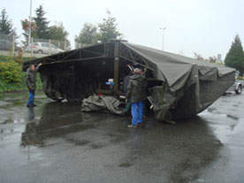 The 60 m² fast set up mobile shelter can be transported by trailer with its own ingenious hydraulic self assembly system, and can be fully erected by two people in just 15 minutes.