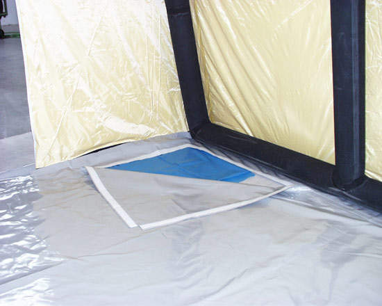 Our standard package for pneumatic tents includes a self-erecting frame including tensioning ropes, a detachable tent cover, two detachable entry covers with doors, a detachable tent bottom, 16 to 28 pegs (depending on the tent size), a hammer, repair material, a bag for accessories, and a valise.