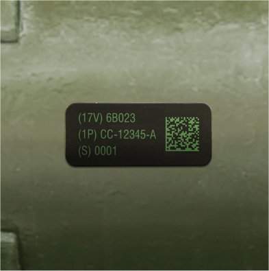 Camcode’s Metalphoto UID CARC labels are designed for MIL-STD-130 applications that require durable labels that will adhere to difficult-to-bond surfaces like chemical agent resistant coating (CARC). This UID label is constructed of Metalphoto anodized aluminum with a specially formulated adhesive that provides outstanding adhesion to CARC surfaces. Teflon is also available when labels must resist CARC painting processes.