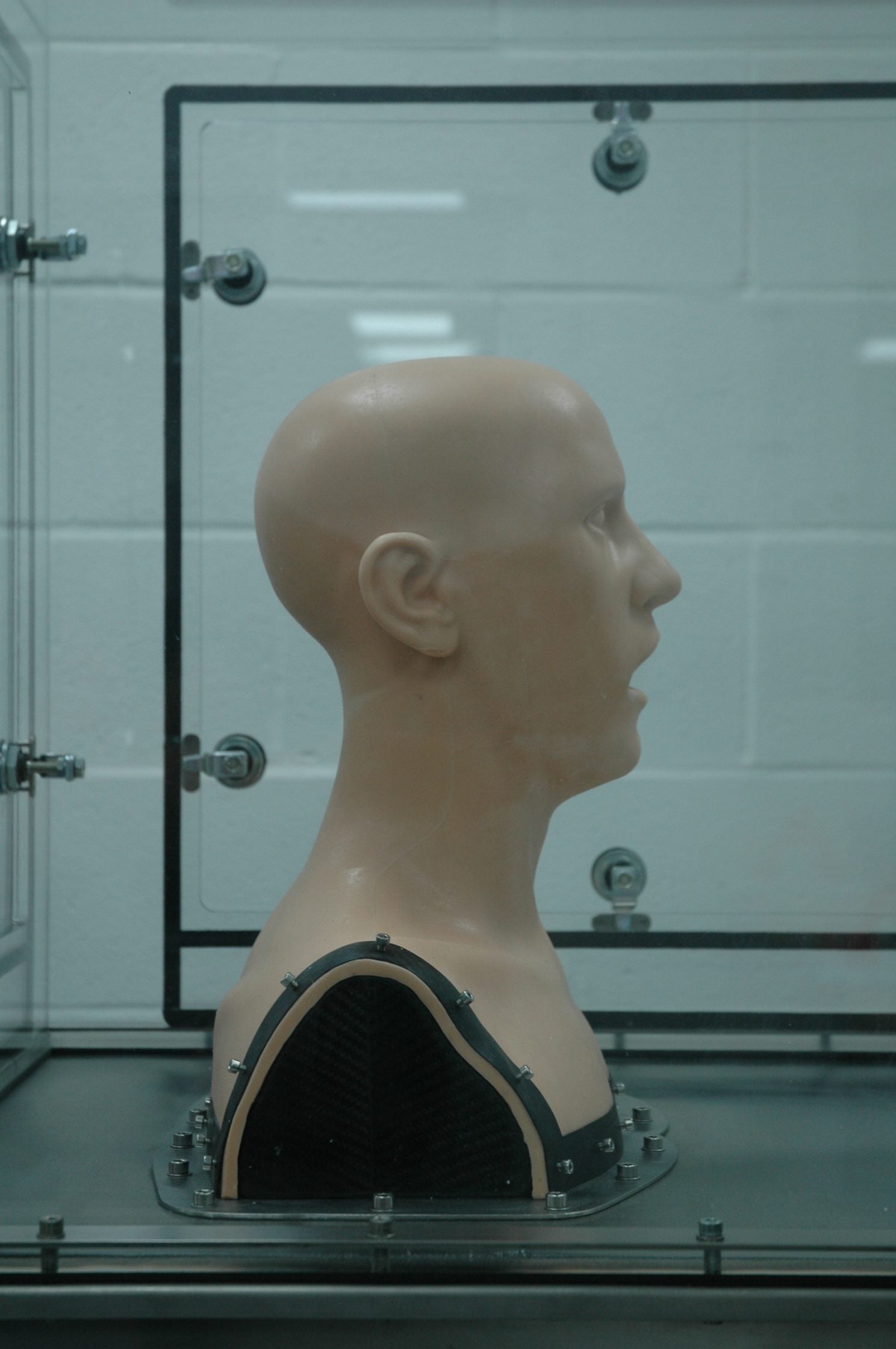 The front of the face has a 30 Shore Hardness elastomer face skin, (different Shore Hardness can be provided), to provide a less resistant locus point for a respirator. The head-form has two sampling ports in the trachea and a further sample port in the right eye. The under-skull is made from a cast aluminium filled resin, providing some thermal mass, and the whole system is mounted on a robust stainless-steel base.