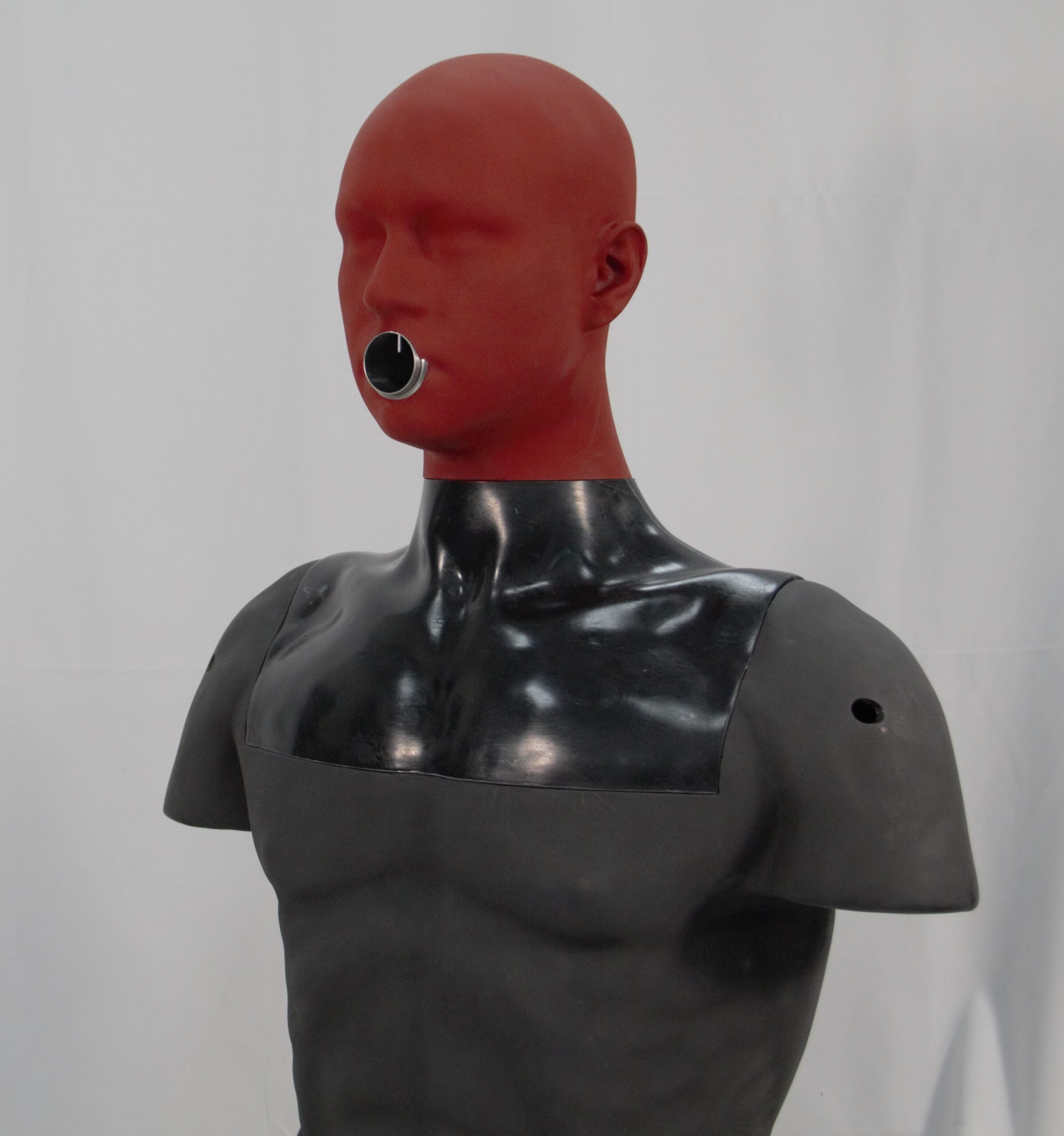 There is also an interchangeable upper body head-form, for use in smaller test chambers and temporary environmental analysis tents. Both the upper body head-form and mannequin have a soft, chemically resistant elastomer skin at garment locus points to provide a realistic seal. This material was specifically developed by i-bodi for this application.