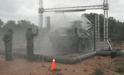 Height and width of the structural metal arc can be adjusted to any military ground vehicle. The arc is also equipped with rotating nozzles for decontaminating with high-pressure foam formation of the liquid decontaminating agent.