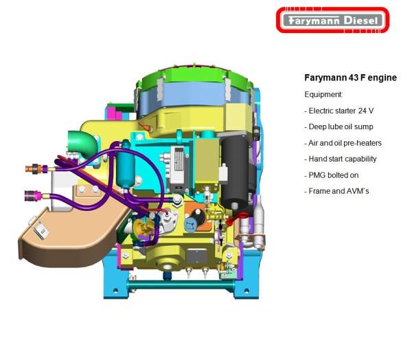 Because of its small envelope, the system driven by a 43-series engine can be assembled on vehicles such as battle tanks, where space for installation is always minimal. 43-series engines have a swept volume of 710cc and are also available in water cooled and air cooled variants.