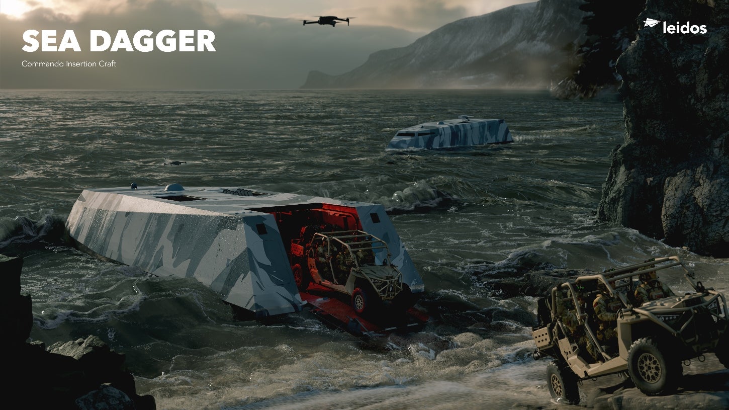 Sea Dagger can be optionally crewed or fully autonomous using the Leidos Autonomous Vessel Architecture. Artificial intelligence reduces crew workload, while a reverse-beaching design enables rapid deployment directly onto littoral shores.