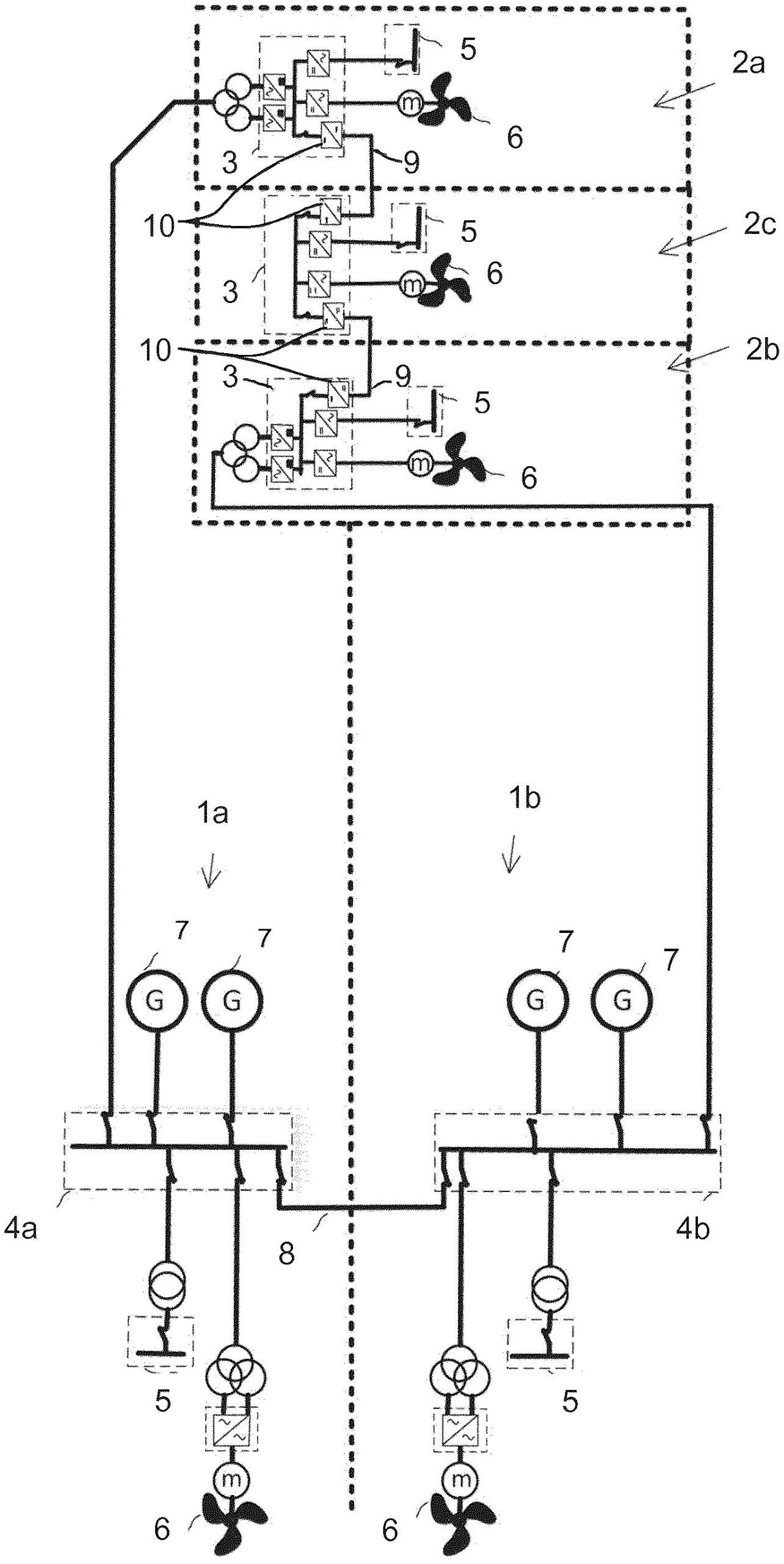Furthermore, the power supply system features auxiliary equipment connected through inverters, an energy storage system, and a balancing mechanism for power consumption among the main redundancy groups. The system is designed to ensure reliable and efficient power distribution for marine thruster systems, with a focus on redundancy and control. By utilizing a combination of directly and indirectly powered thruster redundancy groups, along with a sophisticated power management system, the patent aims to enhance the stability and performance of marine power supply systems in demanding operational environments.