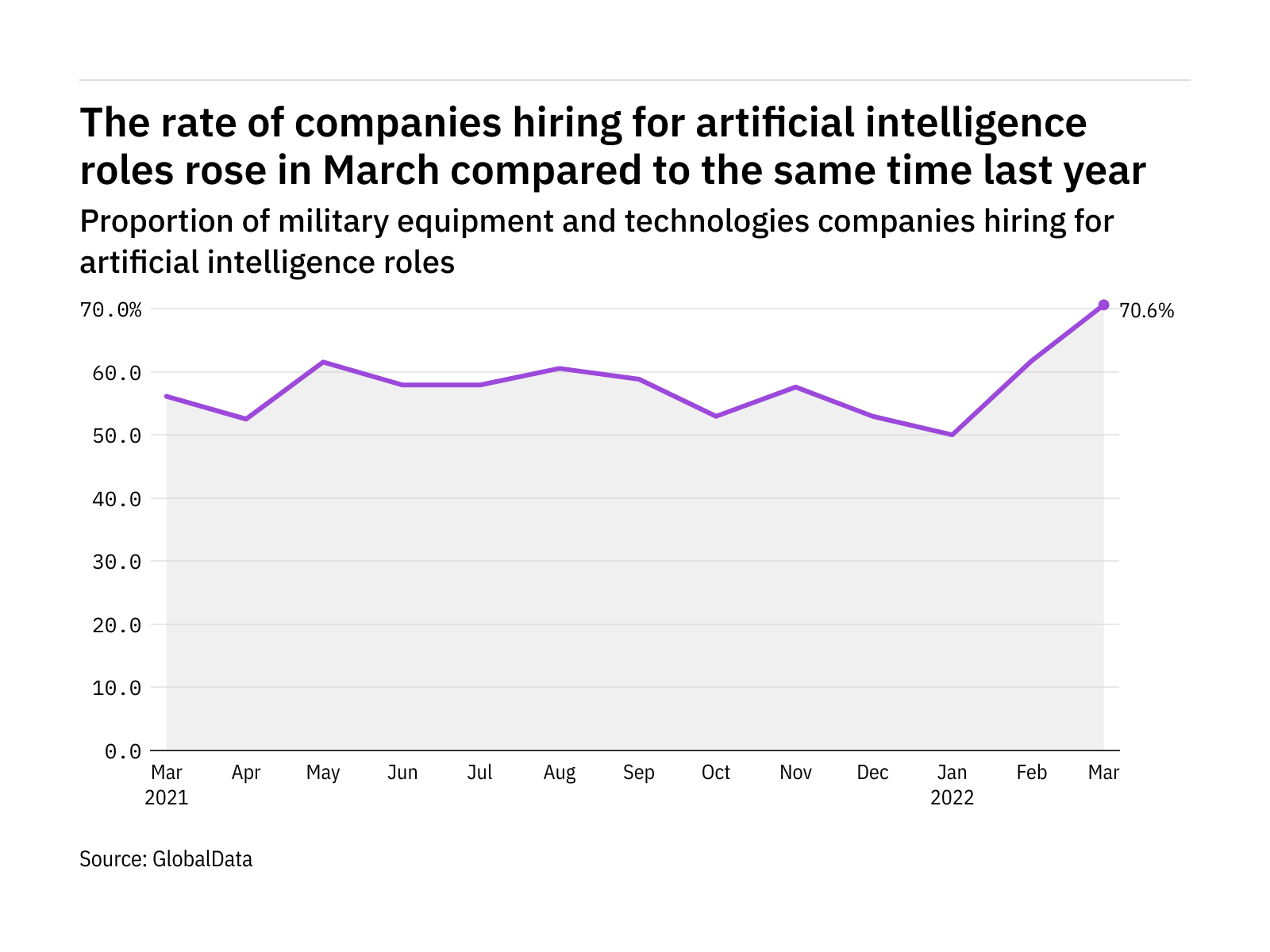 The proportion of military equipment and technologies companies hiring for artificial intelligence related positions rose significantly in March 2022 compared with the equivalent month last year, with 70.6% of the companies included in our analysis recruiting for at least one such position.