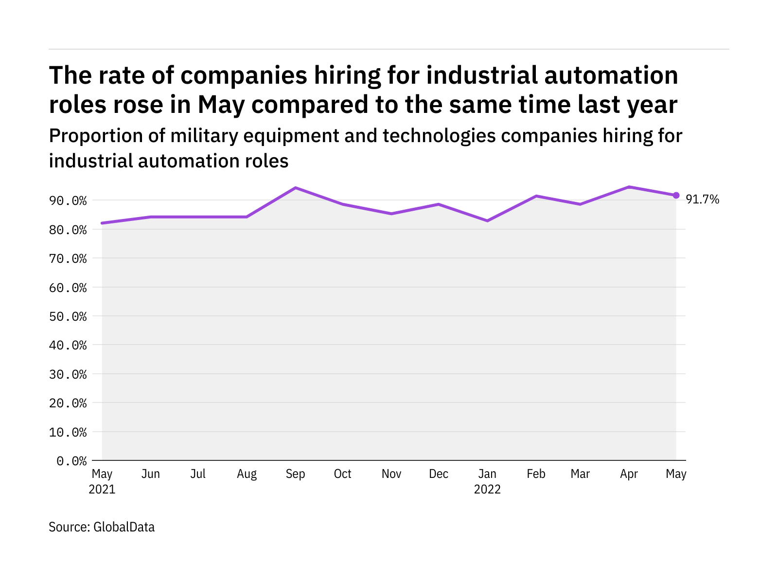 By GlobalDataOur analysis of the data shows that military equipment and technologies companies are currently hiring for industrial automation jobs at a rate higher than the average for all companies within GlobalData's job analytics database. The average among all companies stood at 5.7% in May 2022.