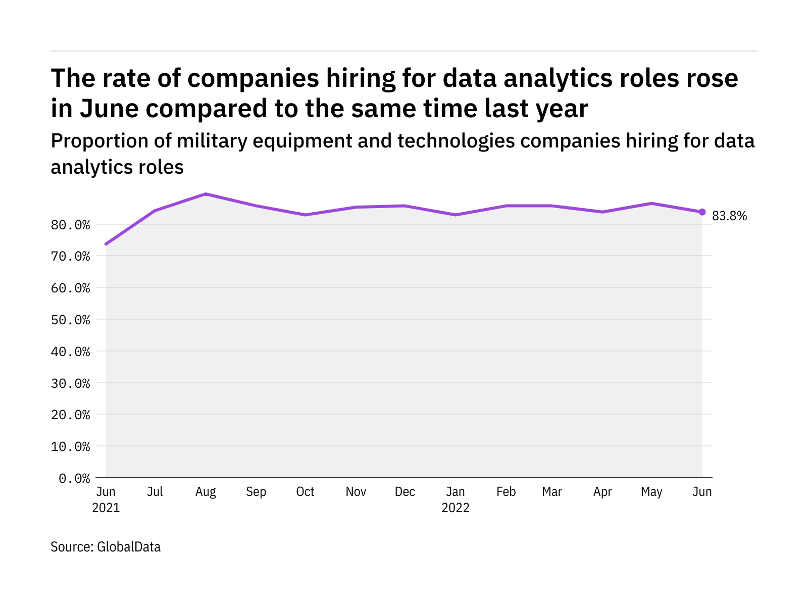 By GlobalDataOur analysis of the data shows that military equipment and technologies companies are currently hiring for data analytics jobs at a rate higher than the average for all companies within GlobalData's job analytics database. The average among all companies stood at 6.1% in June 2022.