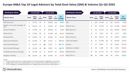 A&O Shearman and CMS have emerged as the top legal advisers in terms of deal value and deal volume, respectively, during the first three quarters of 2025 in the landscape of European mergers and acquisitions (M&A).