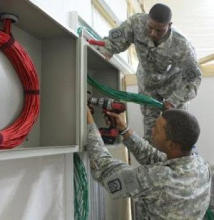 Image: US Army personnel install cable into a termination box at Camp Buehring in Kuwait. Photo: courtesy of Spc Alexis Otero, 160th Signal Brigade.
