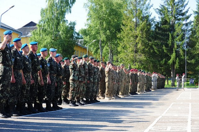 Image: Military personnel stand in formation during the opening ceremony for Exercise Rapid Trident 2013 at IPSC in Yavoriv, Ukraine. Photo: courtesy of Sgt Daniel Cole, US Army Europe public affairs.