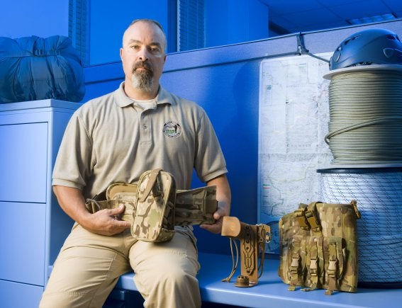 Image: PM SCIE equipment specialist Darren Bean with the new holsters for M320 40 mm grenade launcher. Photo: courtesy of David Kamm.