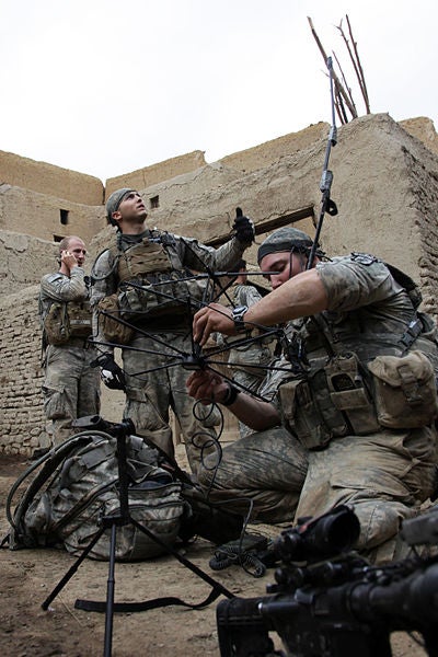Image: US Army personnel setting up a tactical satellite communication system in Wardak province, Afghanistan. Photo: courtesy of Sgt. Russell Gilchrest.