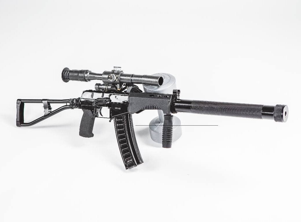 Intended for use by the arming special forces, the modernised compact assault weapon is equipped with a removable silencer and an optical sight.