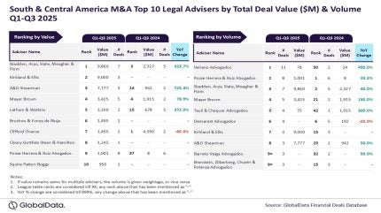 In the realm of mergers and acquisitions (M&A), Skadden, Arps, Slate, Meagher & Flom, and Veirano Advogados have emerged as the top legal advisers in the South & Central American region for the first three quarters (Q1-Q3)of 2025, according to GlobalData, a data and analytics firm.