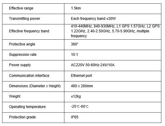 Combines the jammer power amplifier, multiple-frequency antenna, and control panel into a single system, eliminating the need for external connection devices and ensuring a high level of integration.