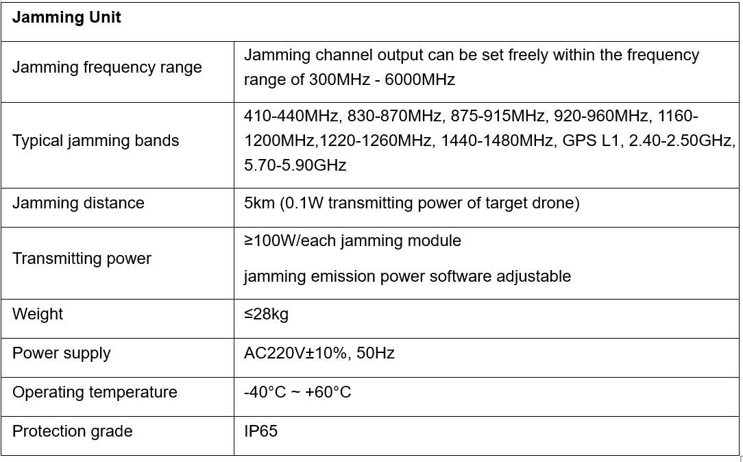 Comprising a Detection Unit (Full-Band RF Detector) and a Jamming Unit (Full-Band Directional Jammer), the system is adept at identifying drones from afar and guiding the Jamming Unit to disrupt the drones’ control and navigation systems, compelling them to either land or retreat.