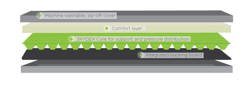 The proprietary SKYDEX Core Technology is a high-performance alternative to foam and inner springs currently used in mattress design. The SKYDEX Core has been specifically engineered to evenly distribute pressure and provide maximum comfort and support for the user.