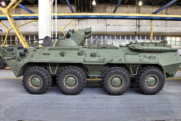 The BTR-82AM amphibious infantry vehicle features a new integrated fighting module mounted with a quick-firing, dual-feed 2A72 30mm cannon with greatly improved fire power. The cannon has a muzzle velocity of 960m/s and can fire at a rate of 330 rounds per minute.