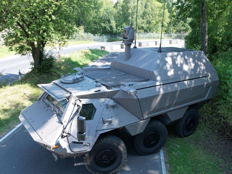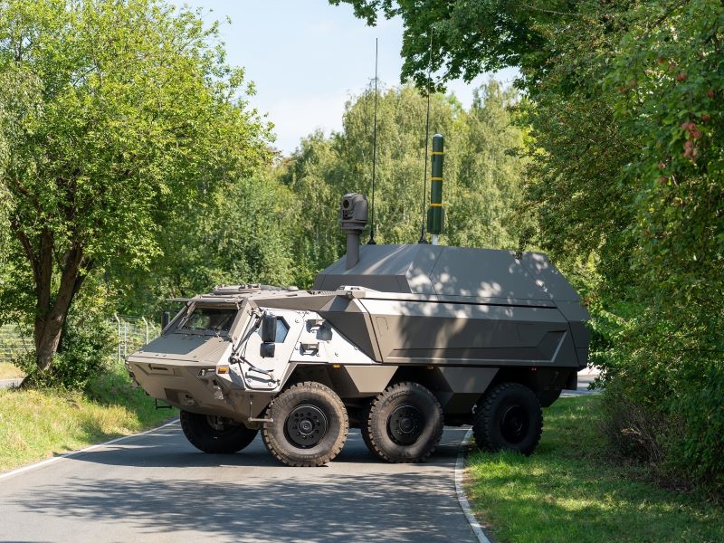 The platform pairs Rheinmetall’s Fuchs Evolution 6×6 armoured vehicle with a vertical launch missile system that can carry up to 24 Lockheed Martin guided missiles, either AGM-179 Joint Air to Ground Missiles (JAGM) or AGM-114L Hellfire Longbow guided missiles.