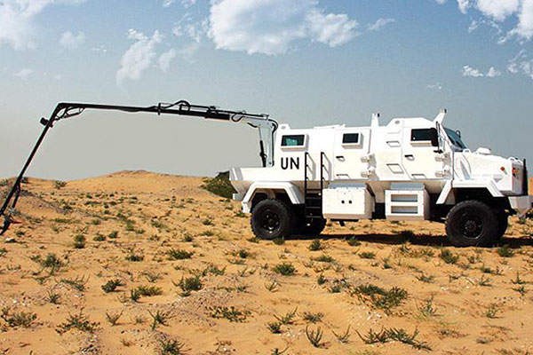 The vehicle is installed with an external articulated arm operated console, PVC arm cover, and a crane manipulator. The bomb arm has a working reach of 6m and lift capability of approximately 200kg. It can also be attached with digging fork, a surface roller, a crust breaker, and a grab hand to lift suspicious objects.