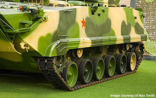 The ZBD-04 features six road wheels with three track support rollers attached to the front drive sprocket on either side of the vehicle. The unevenly spaced road wheels feature rubber tyres.