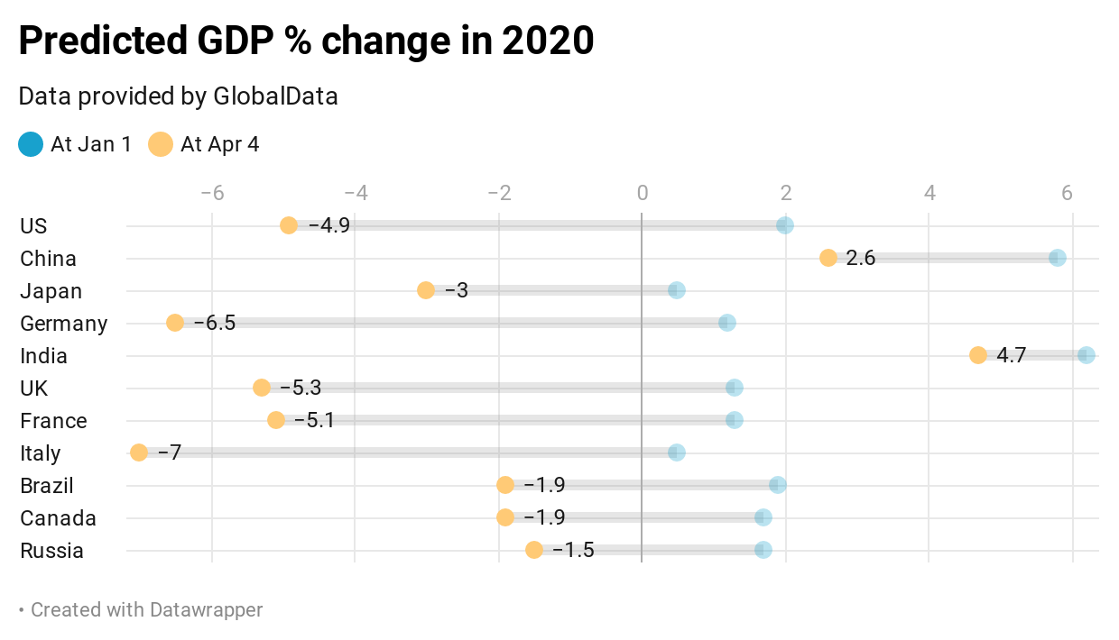 Financial analysts from GlobalData have published new forecasts suggesting global GDP will fall by 0.9 per cent in 2020. Western countries at the heart of the current pandemic will be among the hardest hit – with GDP predicted to fall over the calendar year by 7 per cent in Italy, 6.5 per cent in Germany, 5.3 per cent in the UK and 4.9 per cent in the US.