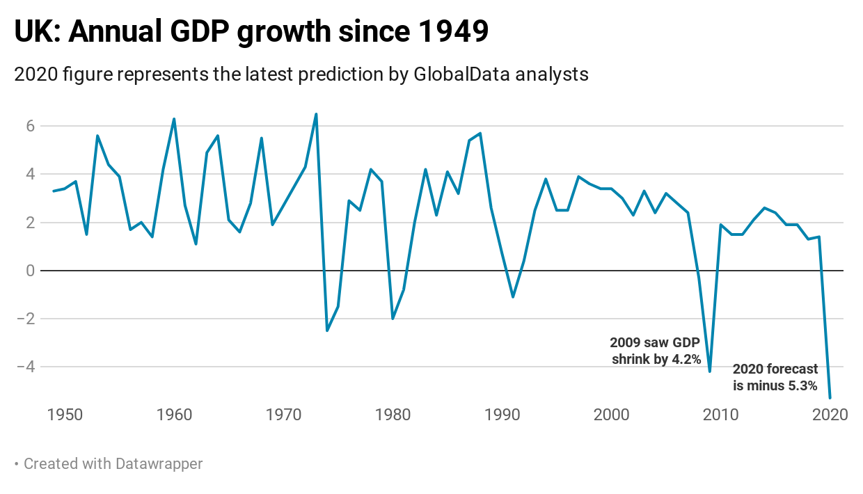 The GlobalData forecasts are for calendar years rather than individual quarters. Other economists have predicted a deep drop-off in the second quarter of this year, followed by a slow return to something resembling normal conditions. That would mean a great deal of economic pain over the summer, easing towards the year’s end. Nonetheless, the overall picture for the year would remain the worst in peacetime.