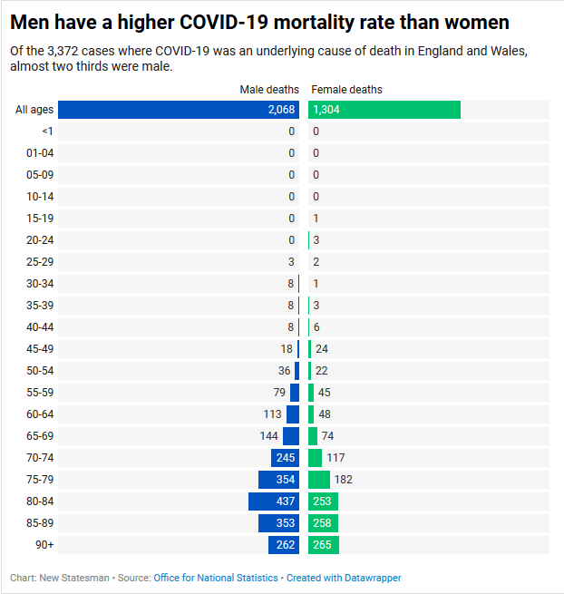 Men had a significantly higher rate of death due to Covid-19 – almost double that of women. The data also confirmed that the elderly were disproportionately likely to die, with death rates increasing rapidly from the ages of 55-59 for men and 65-69 for women. Children seem to be virtually unaffected by the disease, with no deaths of people under 15 recorded in March.